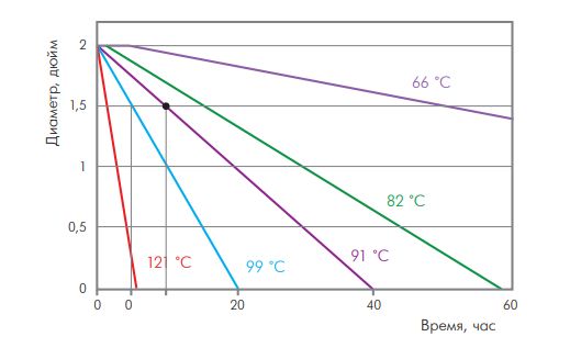 опытные данные по растворимости готового шара размером Ø52,4 мм (2 дюйма) в зависимости от температуры. Данные характеристики отражают зависимость скорости растворения шара от температуры