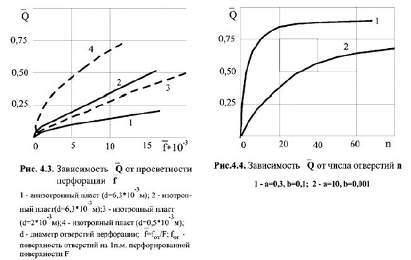 Следует отметить, что производительность скважины, вскрывшей анизотропный пласт при меньшем диаметре отверстий и большем их числе, превышает производительность, получаемую при большем диаметре отверстий, но меньшем их числе (рис. 4.3, кр. 2, 3, 4).