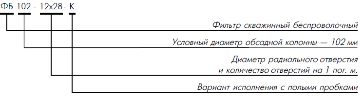 Пример условного обозначения фильтра беспроволочного с полыми пробками с отверстиями диаметром 12 мм при его заказе для обсадной колонны диаметром 102 мм: