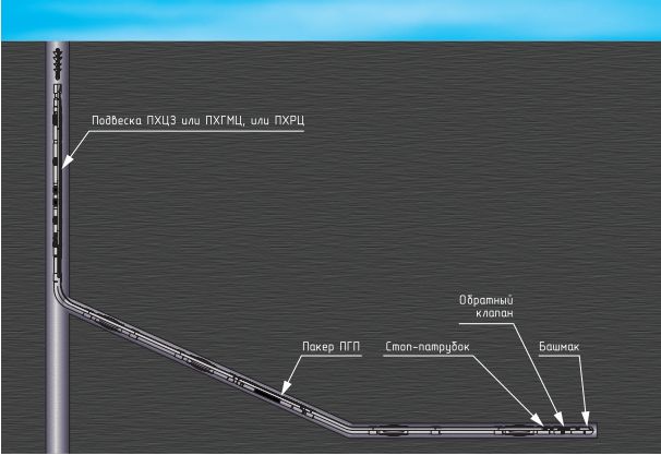 Для крепления скважины цементируемым хвостовиком с сплошным цементированием, с разобщением пластов рукавными пакерами используется следующая компоновка: