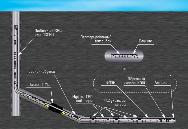 Для крепления скважины манжетно цементируемым хвостовиком, с компоновкой для проведения МГРП и разобщением интервалов набухающими пакерами используются следующие технические средства: