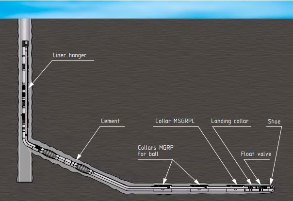 For well casing with cementing liner with continuous cementing with packaging for MSHF the following assembly is used: